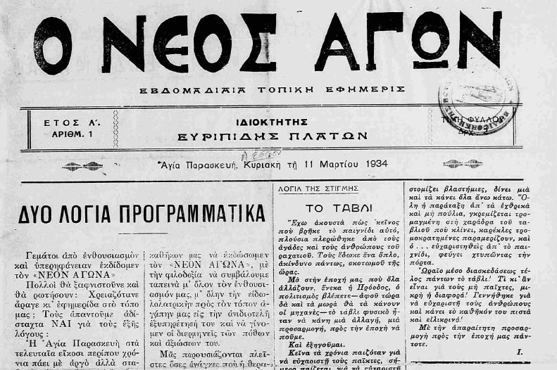 To 1934 πραγματοποιείται μία πολύ φιλόδοξη πρωτοβουλία στην Αγία Παρασκευή Λέσβου με στόχο να διαφωτίσει την τοπική Κοινή Γνώμη γύρω από τα ζωτικά ζητήματα που την απασχολεί, να συντελέσει στην ευημερία του τόπου και να αναδείξει οποιαδήποτε ευεργετική και προοδευτική δράση συμβαίνει εδώ με γνώμονα την βελτίωση της καθημερινότητας των Αγιαπαρασκευωτών. Ξεκινάει η έκδοση μιας εβδομαδιαίας τοπικής εφημερίδας υψηλής ποιότητας με τίτλο «Ο Νέος Αγών», που δεν έχει τίποτα να ζηλέψει από τον αντίστοιχο Μυτιληναϊκό τύπο της εποχής, δείγμα της γενικότερης άνθησης που συντελείται στο κέντρο του νησιού.