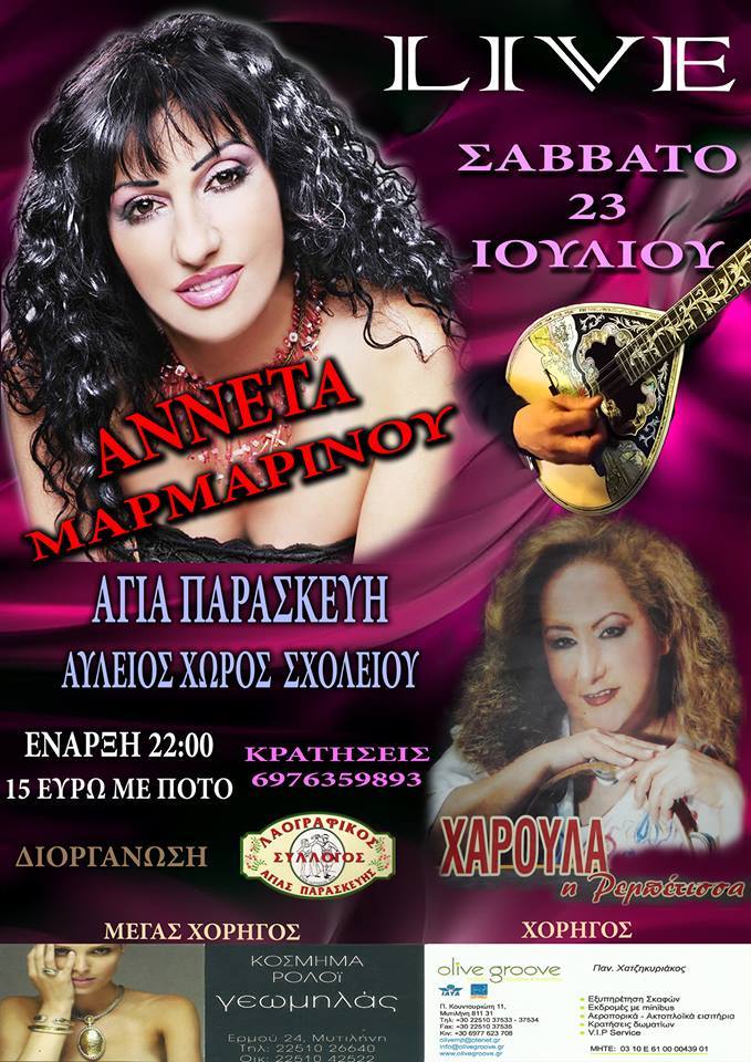 - Στις 23 Ιουλίου 2016 ο Λαογραφικός Σύλλογος διοργανώνει ζωντανή μουσική βραδιά με τη συμμετοχή της Αννέτας Μαρμαρινού και της Χαρούλας της Ρεμπέτισσας στον αύλειο χώρο των Εκπαιδευτηρίων Αγίας Παρασκευής