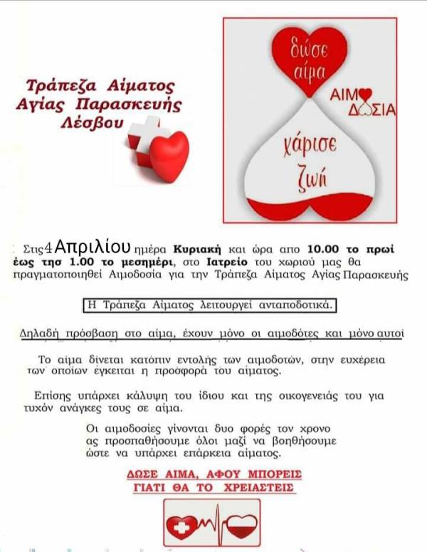 Ο τοπικός φορέας εθελοντών αιμοδοτών Αγίας Παρασκευής Λέσβου έχει προγραμματίσει εθελοντική αιμοδοσία την Κυριακή, 4 Απριλίου 2021. Συγκεκριμένα το πρωί της Κυριακής, από τις 10:00 μέχρι τις 13:00, καλούνται στο Αγροτικό Ιατρείο του χωριού μας όσοι μπορούν και επιθυμούν να προσφέρουν αίμα, ενισχύοντας την Τοπική Τράπεζα Αίματος Αγίας Παρασκευής. Δίνοντας αίμα, χαρίζουμε ζωή!!! Η συνεισφορά όλων είναι πολύτιμη!!!