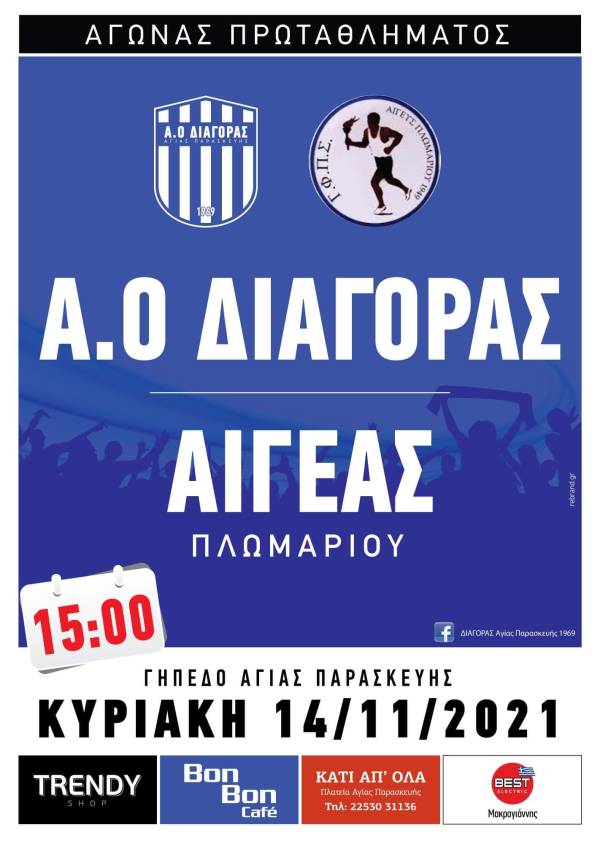 ΔΙΑΓΟΡΑΣ-Αιγέας Πλωμαρίου (Πρωτάθλημα Α’ Κατηγορίας Λέσβου, 14/11, 15:00)