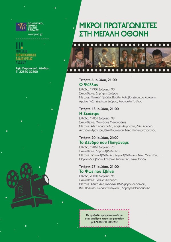 Το Πολιτιστικό Ίδρυμα Ομίλου Πειραιώς (ΠΙΟΠ) οργανώνει, τις Τετάρτες του Ιουλίου (ώρα 21:00), θερινό κινηματογραφικό αφιέρωμα με τίτλο «Μικροί πρωταγωνιστές στη μεγάλη οθόνη», για μικρούς και μεγάλους, στον υπαίθριο χώρο του Μουσείου Βιομηχανικής Ελαιουργίας Λέσβου. Το πρόγραμμα περιλαμβάνει αξιόλογες ελληνικές ταινίες με παιδιά σε πρωταγωνιστικούς ρόλους από τα 80’s αλλά και μεταγενέστερα. Η είσοδος είναι... Continue Reading →