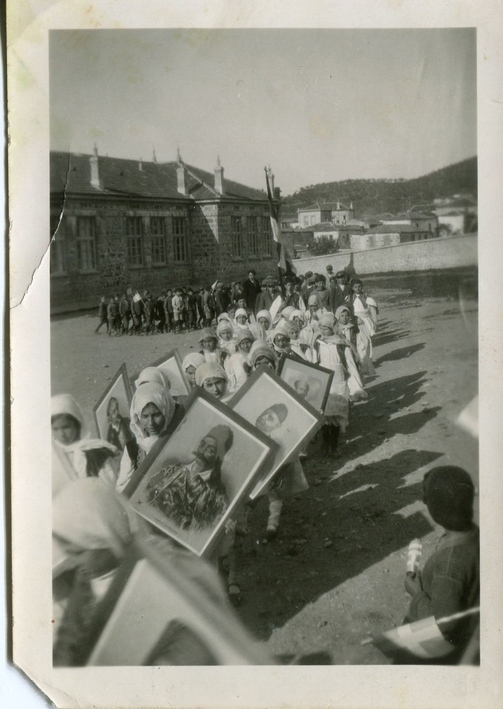Εορτασμός της 25ης Μαρτίου στην Αγία Παρασκευή Λέσβου. Έτος 1931 ή 1933. Μαθητές με εθνικές ενδυμασίες στην πίσω αυλή του σχολείου. Τάξη Στ΄. Δηλαδή τα παιδιά που είχαν γεννηθεί το 1919 (τάξη Κωνσταντίνας Χρήστου Αμπατζή) ή το 1921 (Τάξη Ελεωνόρας Χρήστου Αμπατζή). Αρχείο Ευτέρπης Καλλιντζή.