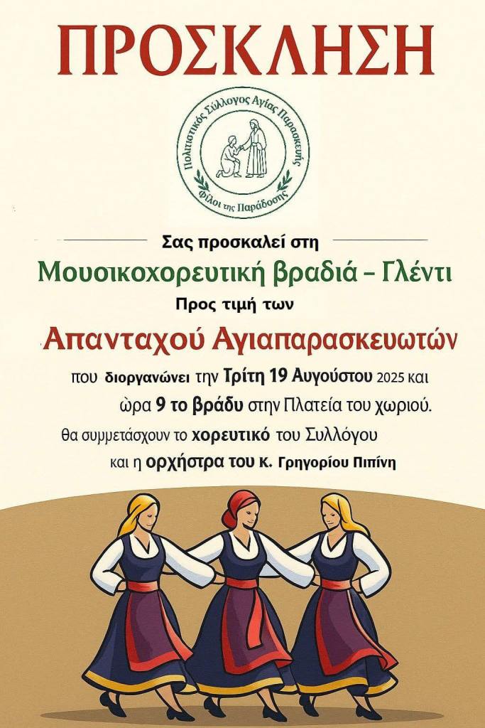 Μουσικοχορευτική βραδιά – Γλέντι προς τιμή των Απανταχού Αγιαπαρασκευωτών Κοινοποιήστε:Tweet Πατήστε για να μοιραστείτε στο WhatsApp(Ανοίγει σε νέο παράθυρο) WhatsApp Κλικ για αποστολή ενός συνδέσμου μέσω email σε έναν/μία φίλο/η(Ανοίγει σε νέο παράθυρο) Email Κλικ για εκτύπωση(Ανοίγει σε νέο παράθυρο) Εκτύπωση Μου αρέσει! Φόρτωση... Σχετικά Τα σχόλια είναι απενεργοποιημένα.